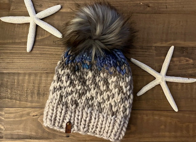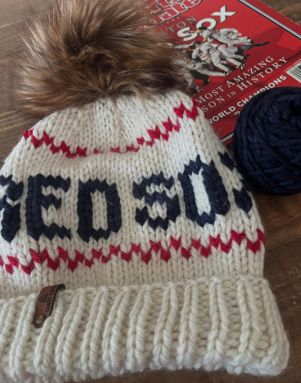 Many Sandy hats are designed by Leslie who uses 100% wool yarn and a removable pom pom. In her knitting and designs, Leslie strives for the unexpected and uniqueness when it comes to color, design, and the direction of each hat. From the first cast-on to the final stitch, every hat embodies artistry, attention to detail, and classic New England style!
